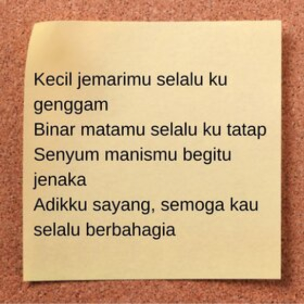 125 Ucapan Ulang Tahun Untuk Kakak Yang Paling Berkesan Trimelive. Ini adalah 5 puisi yang membicarakan tentang hal-hal tersebut dan lainnya. Adik adalah manusia yang seorang tua dengan kita dan sedarah dengan kita.